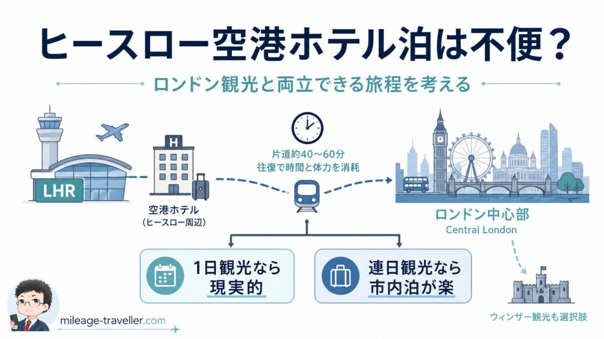 ヒースロー泊は、ロンドン観光の本拠地というより、空港利用前後に荷物を置き、翌日の移動を短くするための拠点として考えます。