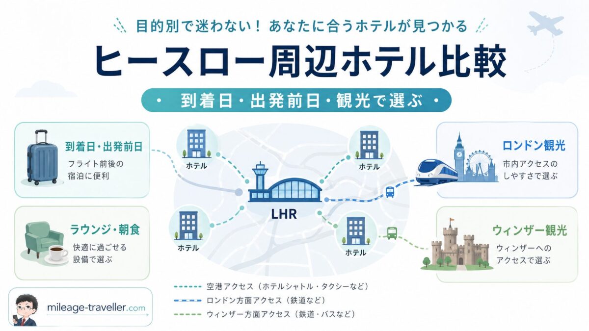 まずは「ヒースロー到着日・出発前日・乗り継ぎ前後の移動負担」「ラウンジや朝食」「ロンドン観光との移動時間」「ウィンザー観光を入れるか」を決め、そのうえで候補を2〜3つに絞ると、予約画面で見るべきホテルが減ります。