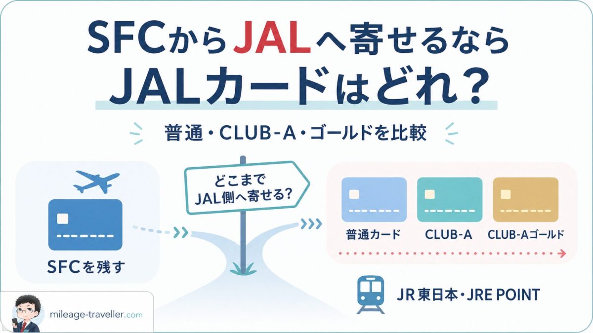 ANA側にSFCを残しながら、JAL便・JALマイル・JR東日本・日常決済・海外旅行保険のどこをJAL側へ寄せるかで、選び方が変わります。