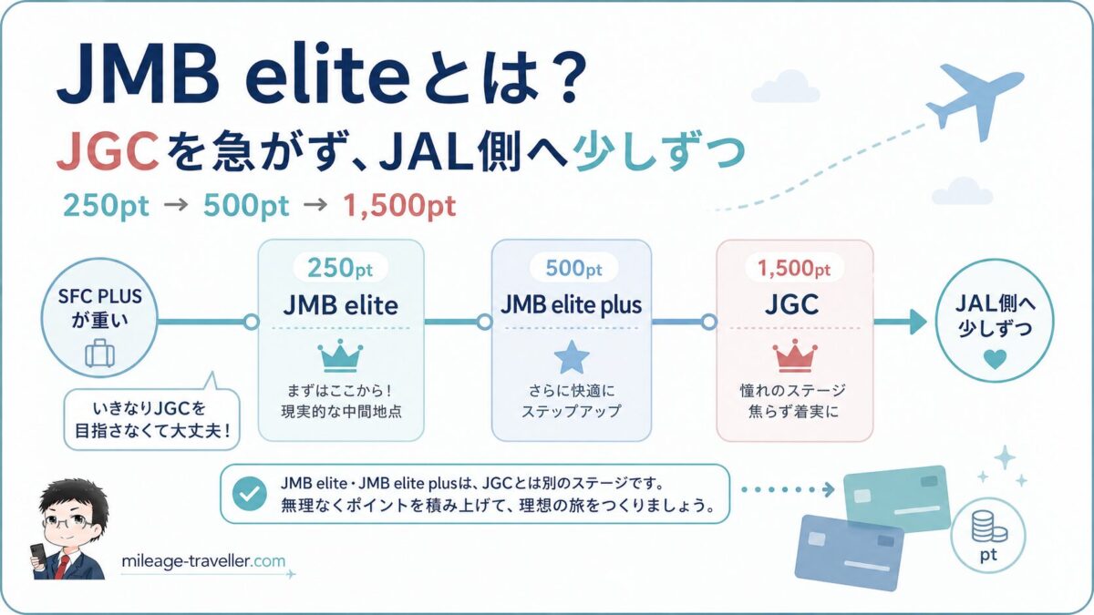 一方で、JGCを急がずJAL側へ少しずつ寄せたい人にとって、JMB eliteは最初に意識しやすい節目です。